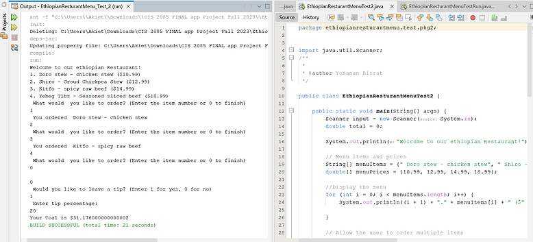 I used Apache NetBeans to create this project for my CIS Java I class. It is about the Ethiopian Restaurant Menu. The app allows users to quickly look at the menu items, including the name and price of the food item. The input it needs is the food name, price, tip for the waiter, and description of the food.​